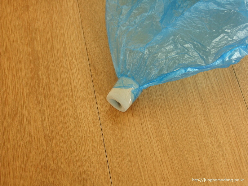 그리고 파란 쓰레기봉지의 구멍낸 부분에 체어슈즈 바닥쪽(방금 커터칼로 도려낸부분)이 쏙 들어가게 한 뒤에체어슈즈 몸통에 적절히 두고 스카치테이프로 몇번 감습니다. 감는 가장 중요한 목적은 감은 부분이 공기가 세지 않을 정도구요... 3~4회정도 감아 줍니다.
