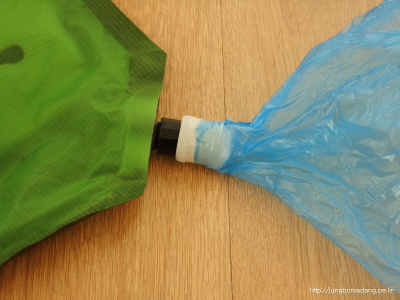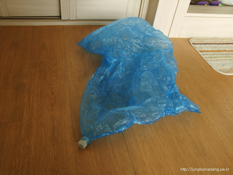 그리곤 비닐에 공기를 많이 담도록 최대한 부풀린 다음 입구 부분을 손으로 감사고, 비닐을 눌러서 공기를 주입하시면 됩니다. 저같은 경우 4회정도 실시하면 빵빵하게 채워지더라구요.