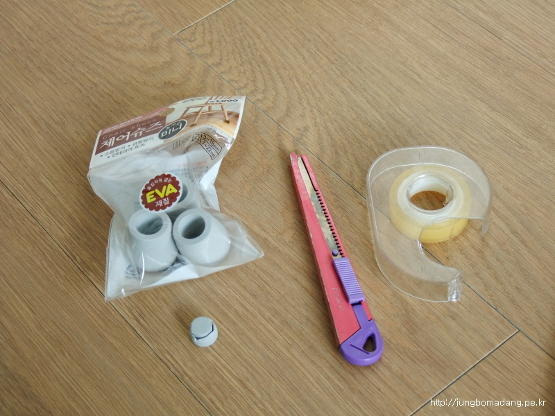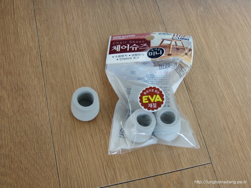 두둥~ 체어슈즈라는 제품인데요. 가격은 1000원, 의자 소음 방지용이라 무려 4개나 들어 있습니다. 즉~ 비닐 에어펌프를 네번(네개) 만들 수 있다는 의미 입니다.