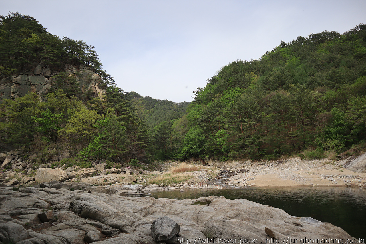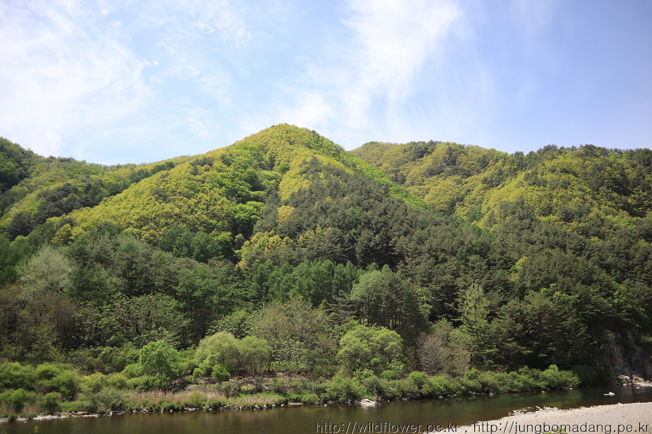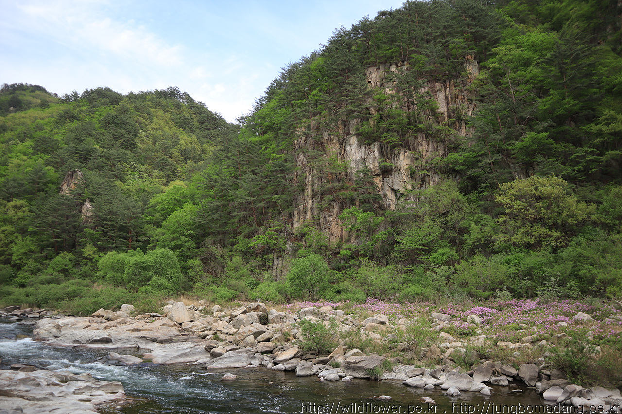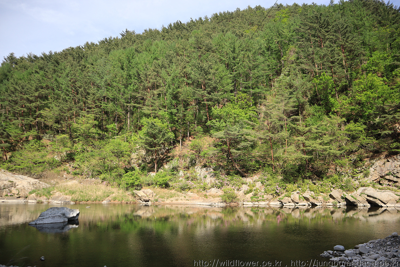 강 건너 벼랑에 소나무가 위태롭지만, 조화로움이 멋집니다.