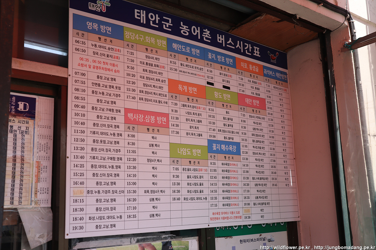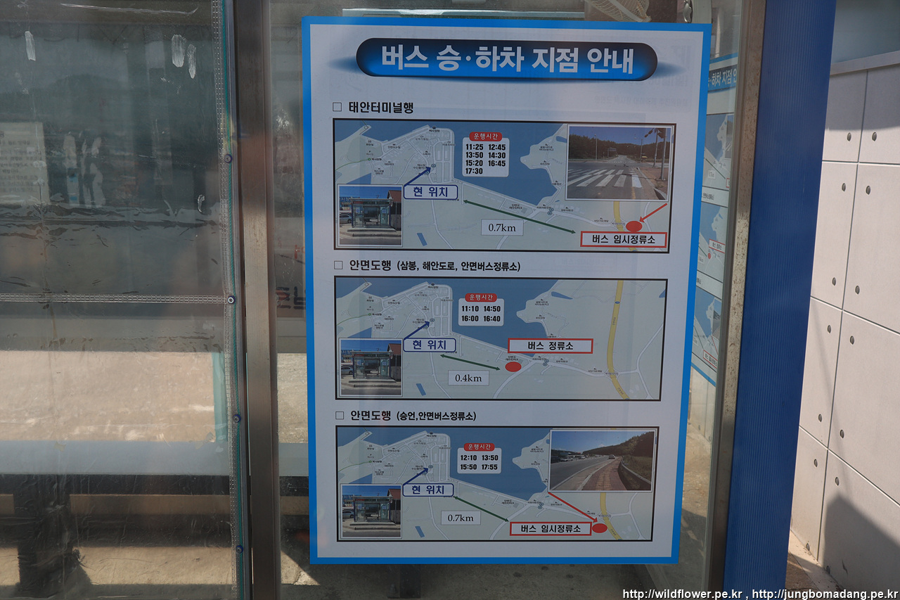 태안으로 바로가는 버스는 없고 황포에서 21분 소요되어 안면읍내에 도착하여 여기서 태안가는 버스로 다시 갈아타야 합니다. 시간표를 찍어두고 젤 급한 볼일을 보기 위해 하나로마트로 향합니다.