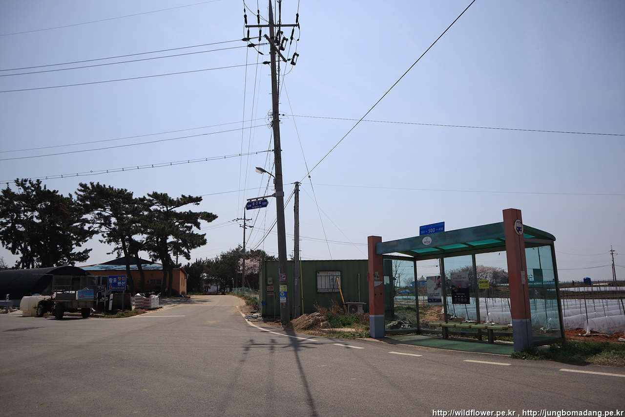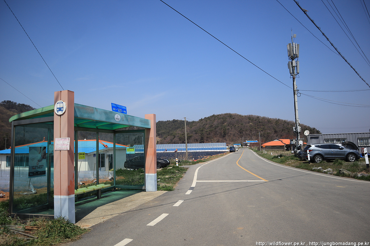 버스정류장 도착! 여긴 4거리입니다. 태안으로 나가려면 정류장 건너편에서 타게 됩니다. 버스시간표가 정류소에 안 붙어 있어 12시 30분 버스로 생각하고 기다리고 있는 데, 동네 맘씨 좋은 어르신이 13시에 버스 지나간다고 알려주시네요.