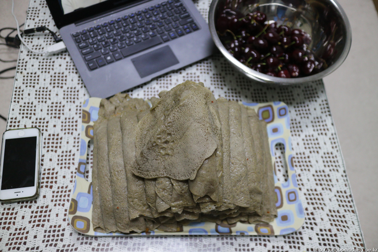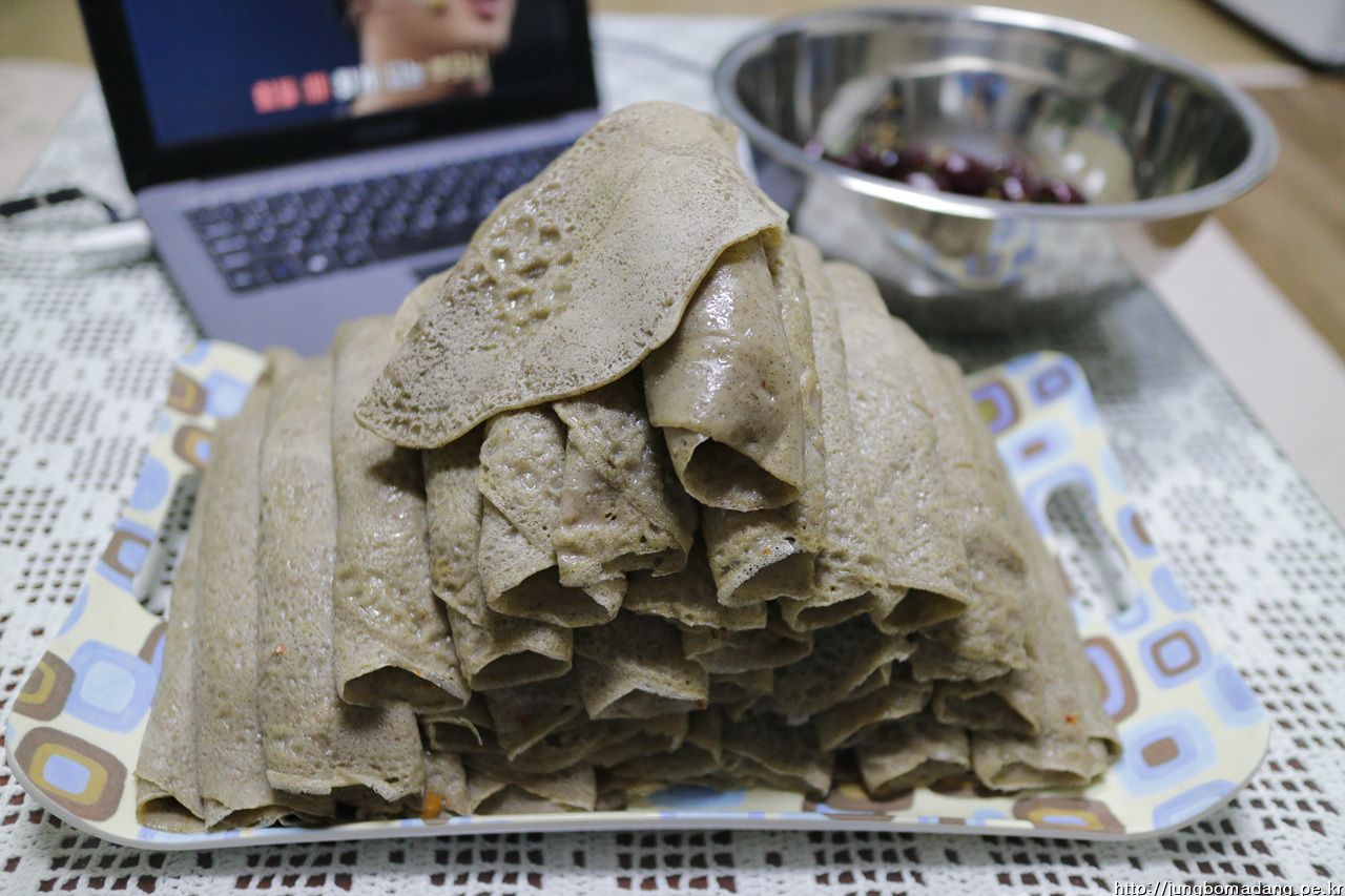 전날 어머니와 힘을 합쳐 메밀전병을 한 봉지(900g)를 모두 소비해 가며 빚어서 먹습니다. 어머니는 부치고 이몸은 옆에서 속을 넣어 말고 ㅋㅋㅋ