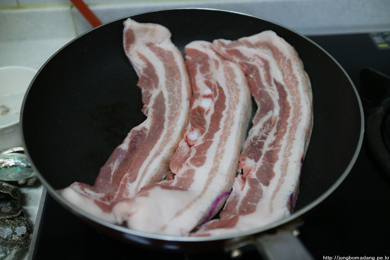 기름 튀지 않게 뚜껑 덮는 센스! 소금이 없어 바싹 구워줍니다. ^^