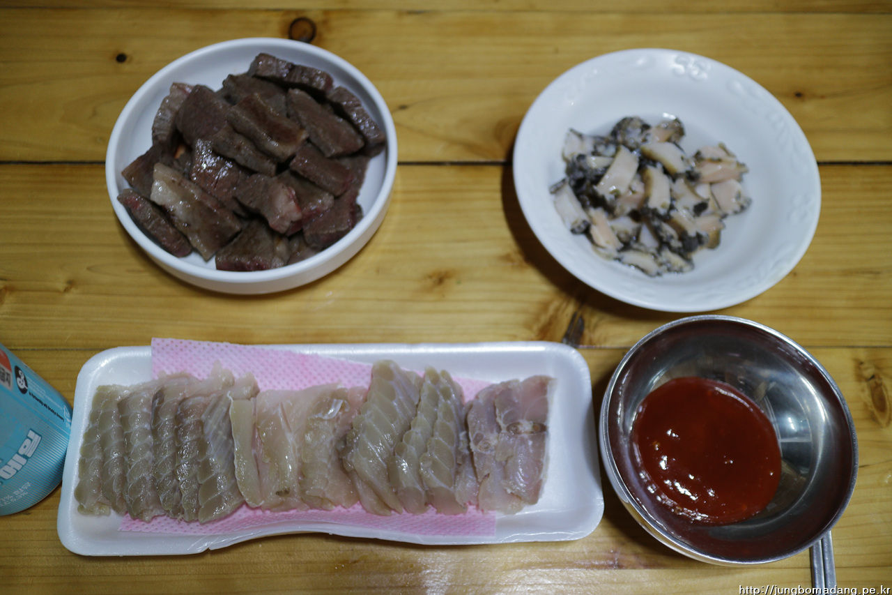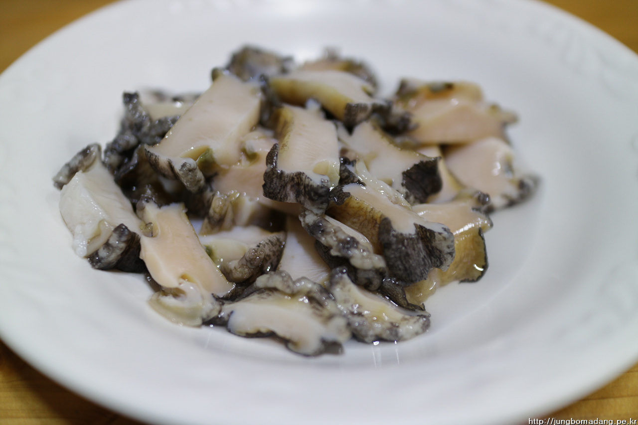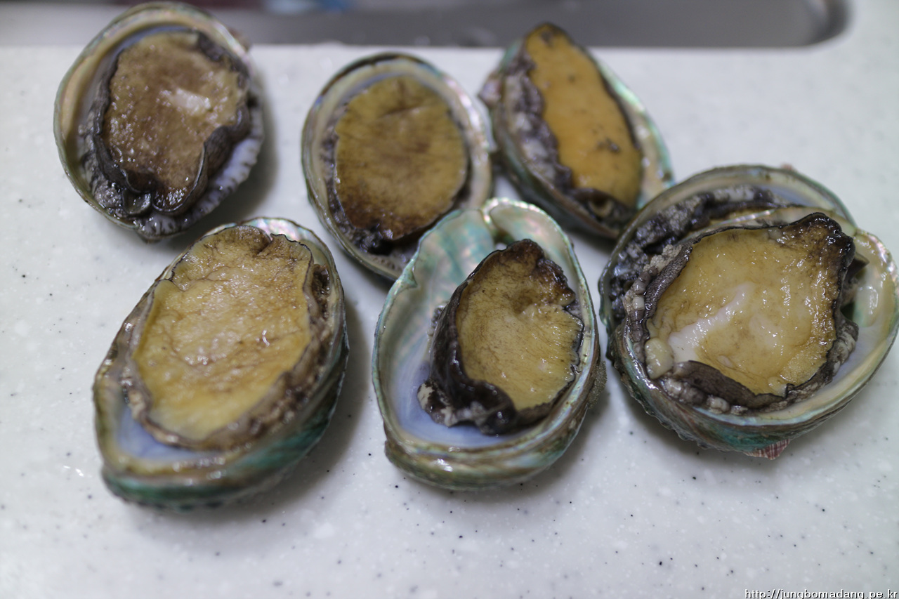 전복 먼저 손질을. 회로 썰어 먹기 위해 숟가락 파내서 이빨, 내장 제거합니다.