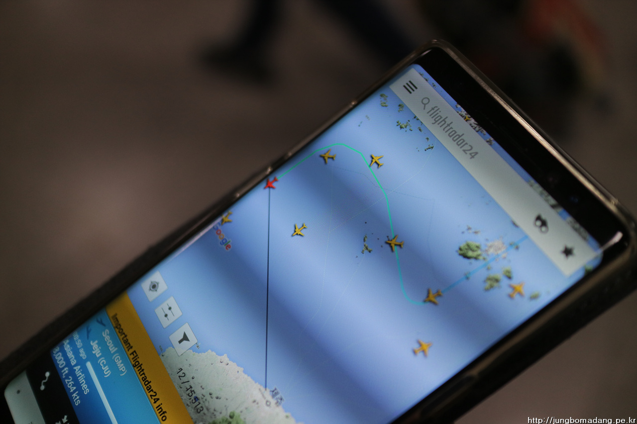 남은 일행이 타고 있는 비행기 현위치를 스마트폰 어플로 실시간으로 확인합니다. 제주 근처에 와서도 비행기들이 몰려서 순서를 기다리느라 착륙이 지연되는 상황!!