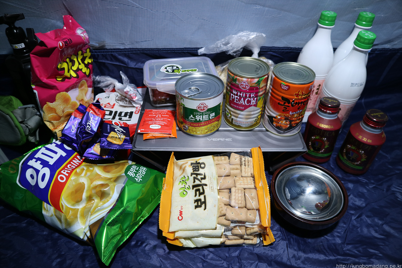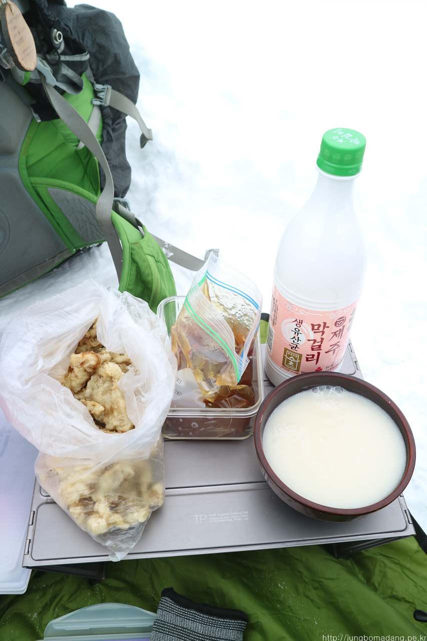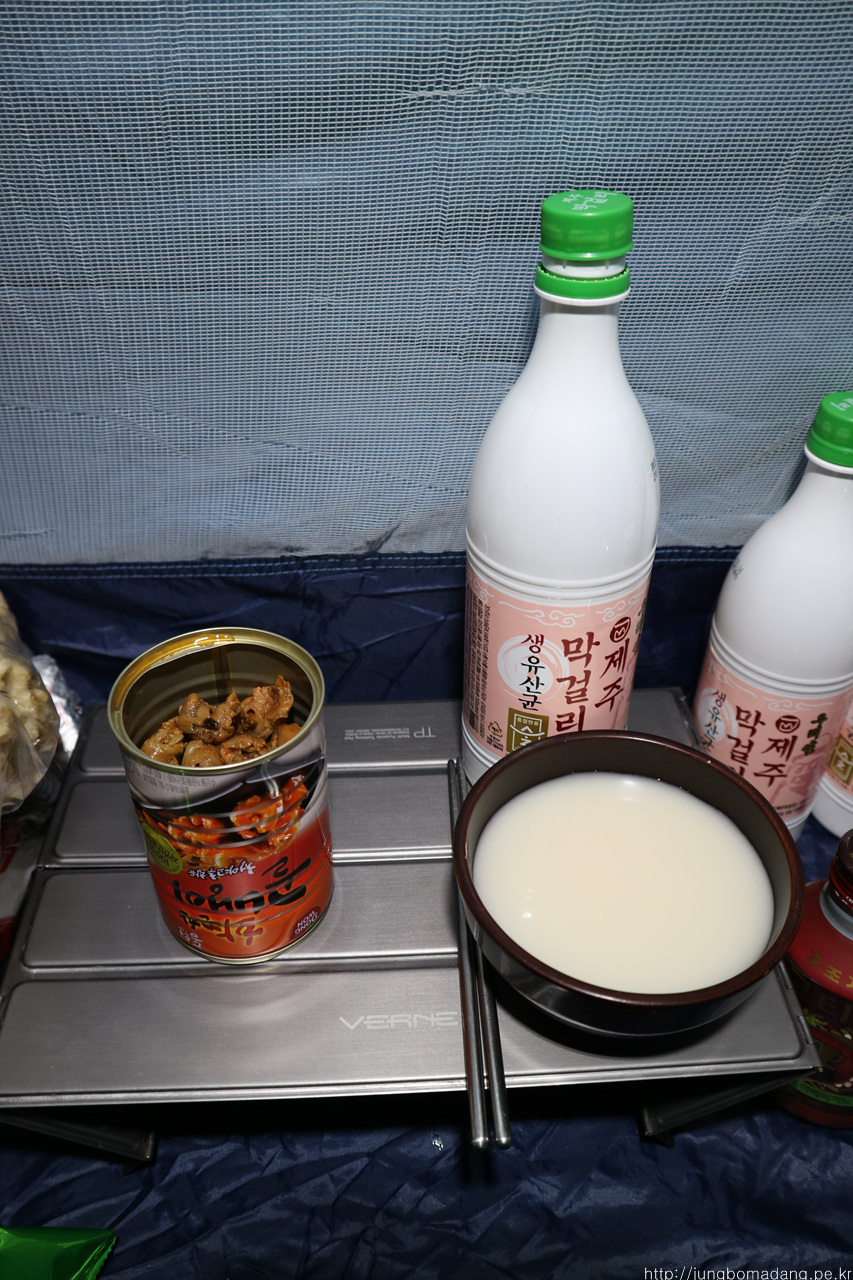 간단히 배를 채워봅니다. 탕슉은 제주 오기 전날 배달 시킨 찹쌀탕수육을 소스까지 챙겨왔는 데 산에서 먹으니 별미네요 ^^
