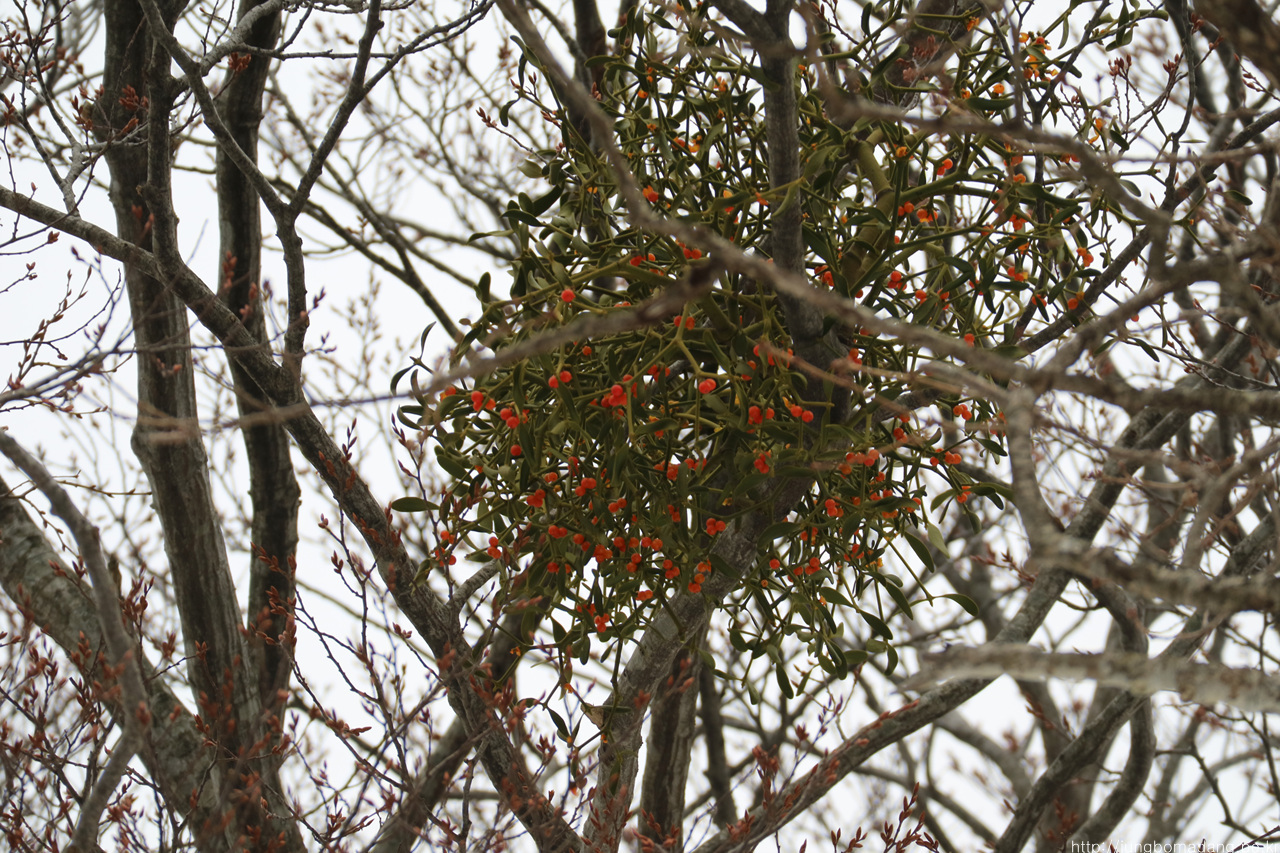 버스정류장에 도착하여 버스를 기다리는 시간! 요래 나무 위에는 겨우살이가 빨간 열매를 뽐낸고 있었습니다. 망원으로 찰칵!