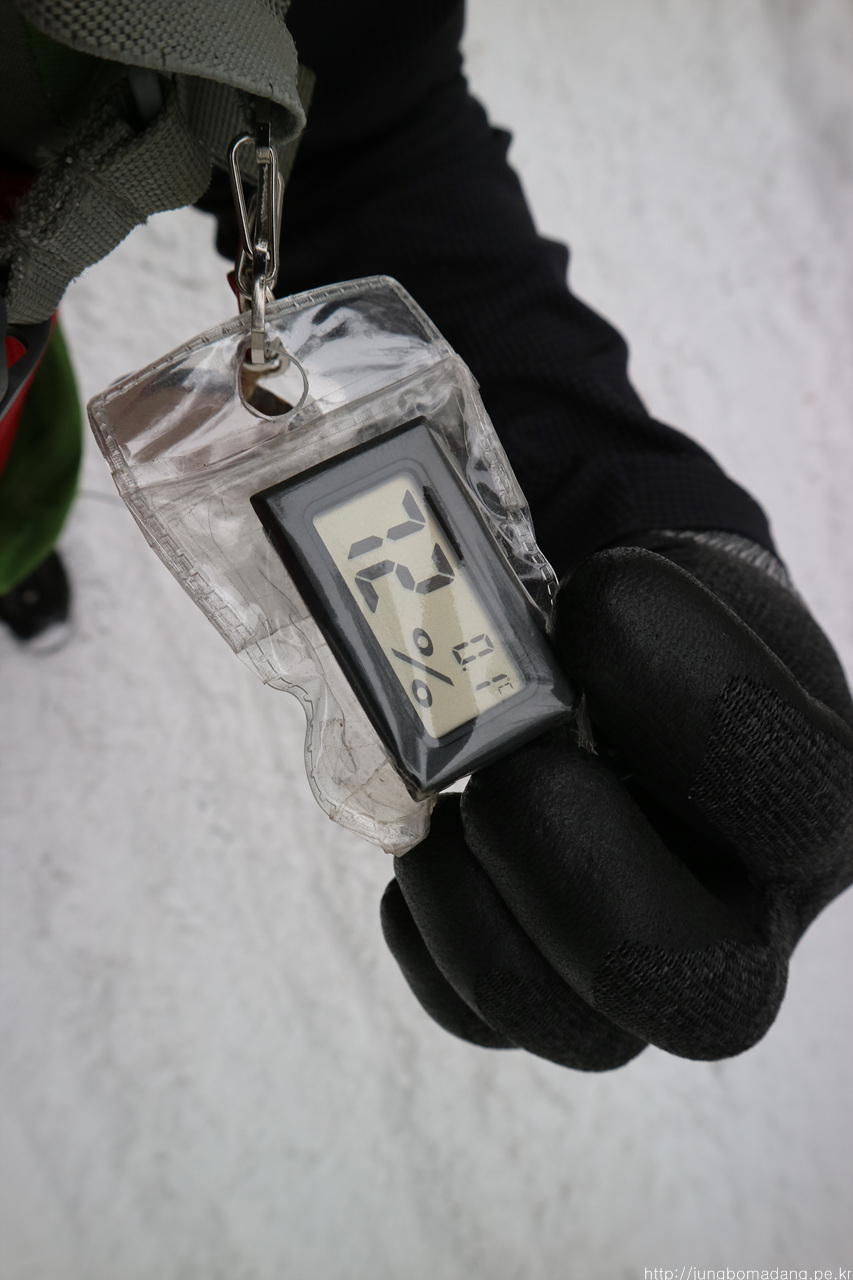 적설상황. 화장실에 들려서 영역도 표시하구요. 아이젠 스패츠 장착 완료!