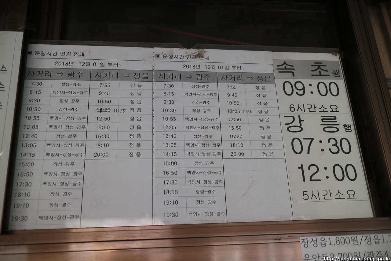 직행버스가 있고, 군내버스가 있어요. 직행버스는 광주광역시에서 오는 버스로 백양사까지 10분 소요되고, 요금은 1500원, 표는 터미너 내에 매표창구에서 구매하면 됩니다(카드 가능)