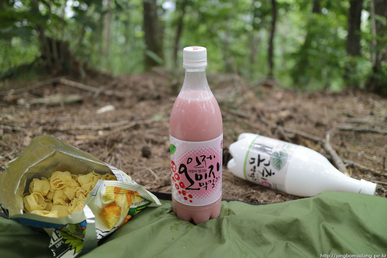 어느정도 정상에 가까워졌다고 판단해서 점심을 먹고 가기로 합니다. 곰취막걸리에 꼬북칩 냠냠