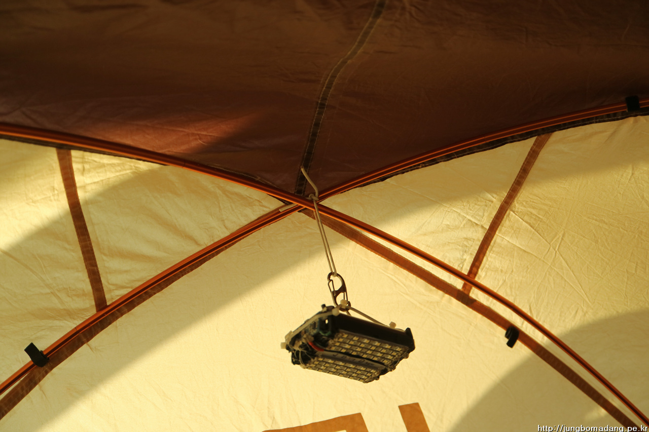 담날 늘어진 고무줄 대신 카라비너로 대체해서 다시 랜턴 고정. 근데 강풍으로 달그락 달그락 약간의 소음이 있네요. 그나마도 바람소리에 뭍혀서 잘 안들리는 소음 ㅋㅋㅋ