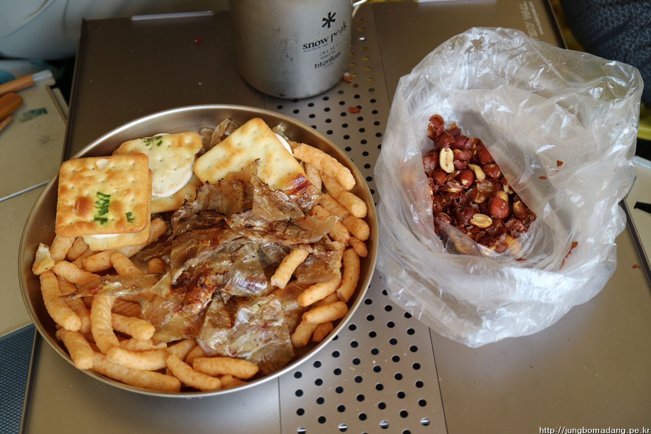요건 깜짝 게스트로 제가 챙겨온 제가 직접 담근 3개월 된 야관문주(25도짜리로 담금)를 100ml만 먹고 남은거 한분에게 나눔해드리는 모습이구요. 우측 스노우라인(에코젠 재질) 물병이 제것입니다.