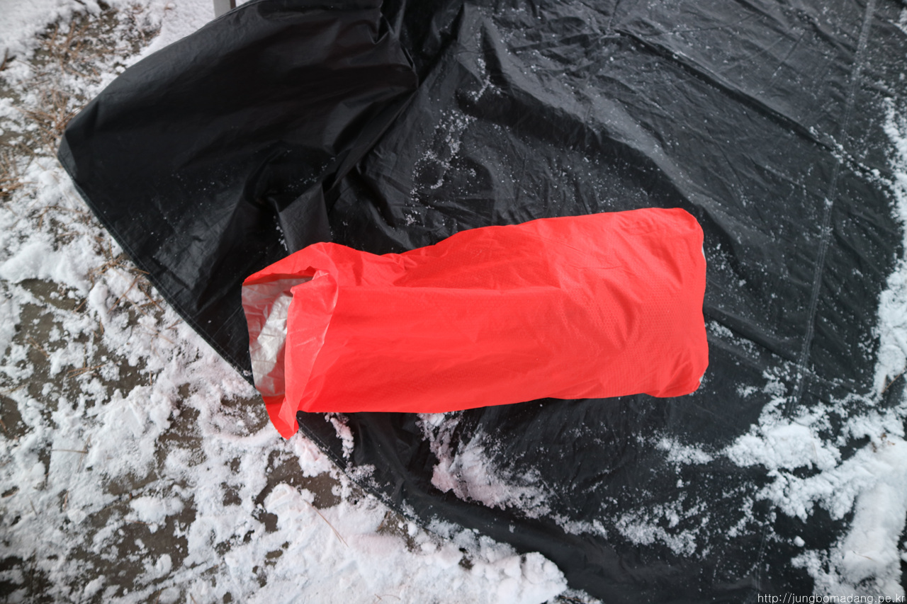 눈이 얼어서 뭍은 텐트는 요래 에어매트 펌프로 사용했던 방수색에다가 넣어서 배낭에 넣습니다.