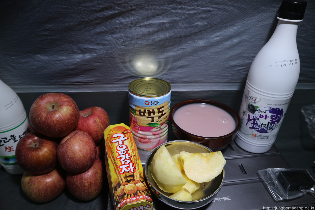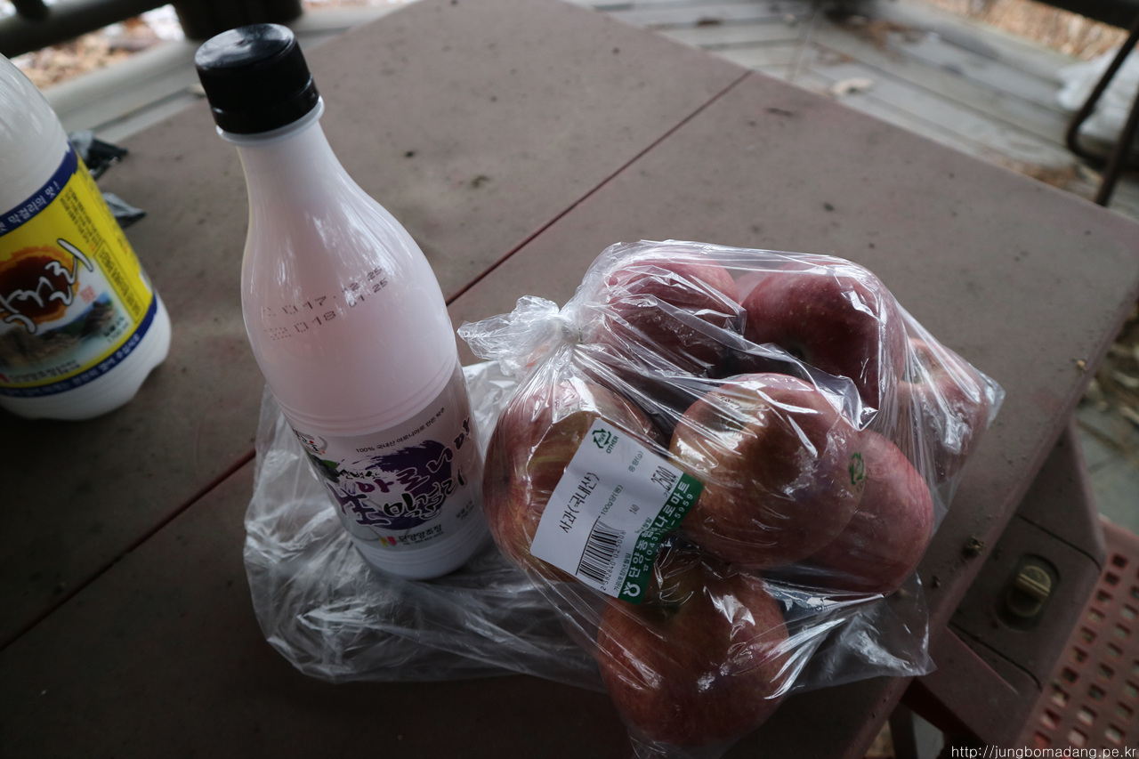왼쪽을 3000원짜리 아로니아 막걸리, 우측은 사과 10개에 2500원