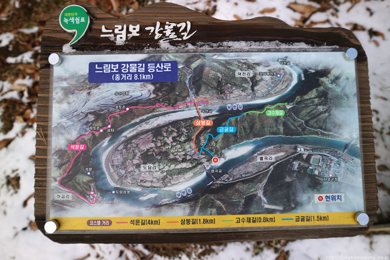 저 앞에는 앞으로 가야될 도담삼봉부터 시작되는 느림보 강물길이 보이구요. 지금 지나는 거친 등산로보다는 매우 착해 보이네요.