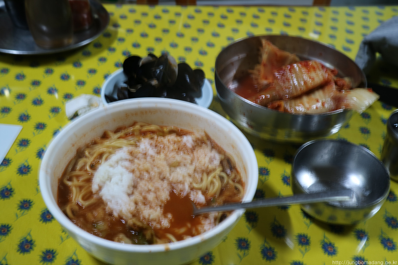 사진이 흔들렸는 데... ㅠ 할머니가 갑자기 밥을 주신다고 합니다. 거기다 직접 담근 김장김치에, 추가로 짬뽕 국물까지... 산에 올라가서 추운데 자려면 든든하게 먹어야 된다며... ㅠㅠ 감동이네요.
