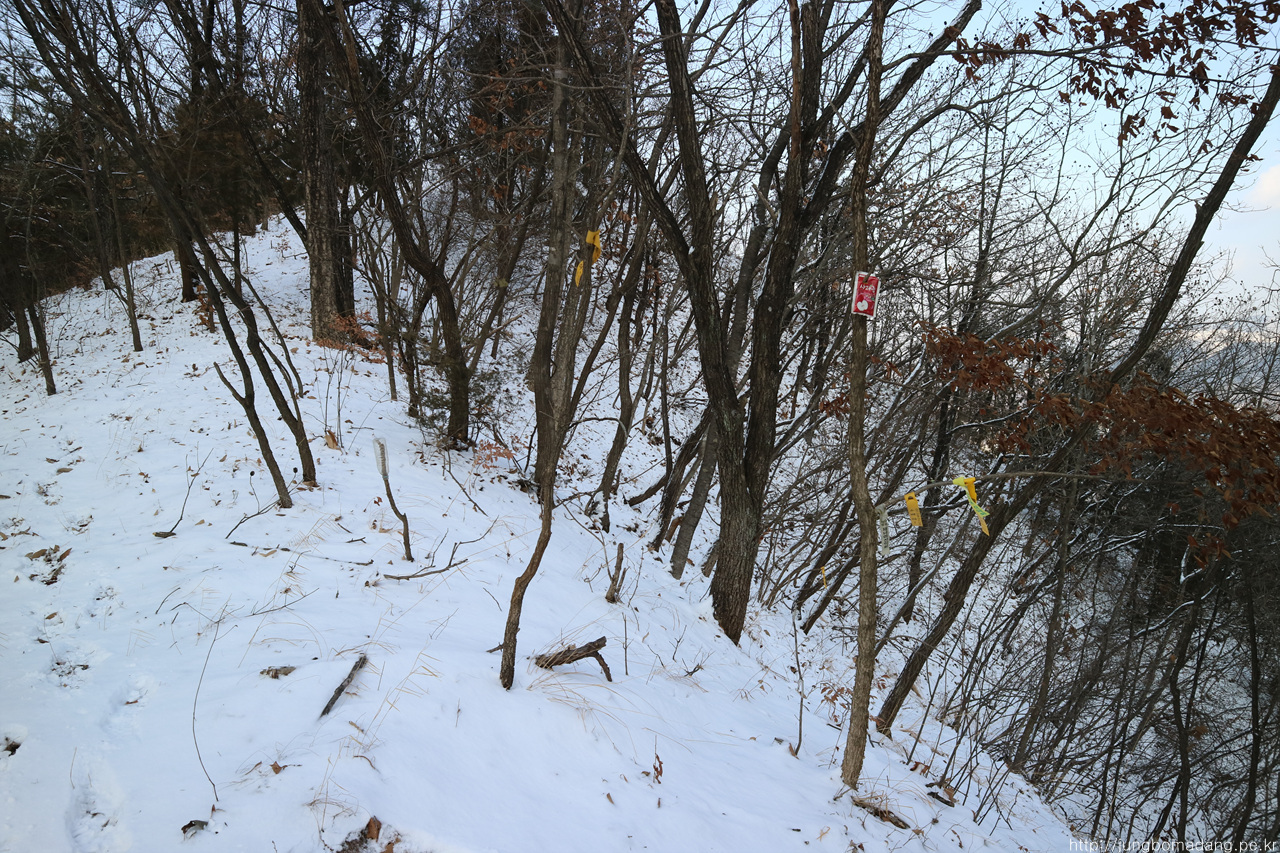 경사도 급하고 등산으로 거의 보이지 않아 요래 리본을 찾으면서 기존 산객들이 지나갔던 희미한 흔적을 찾아 갈지자 방향으로 어느정도 나무에 의지해서 내려가야 합니다.