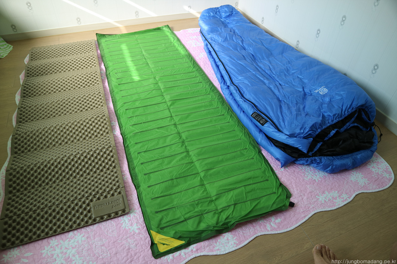 바닥공사는 요래 했습니다. 좌측부터 지라이트 발포매트, 스노우라인 라이트업 에어매트. 침낭은 큐뮬러스 테네카 700.