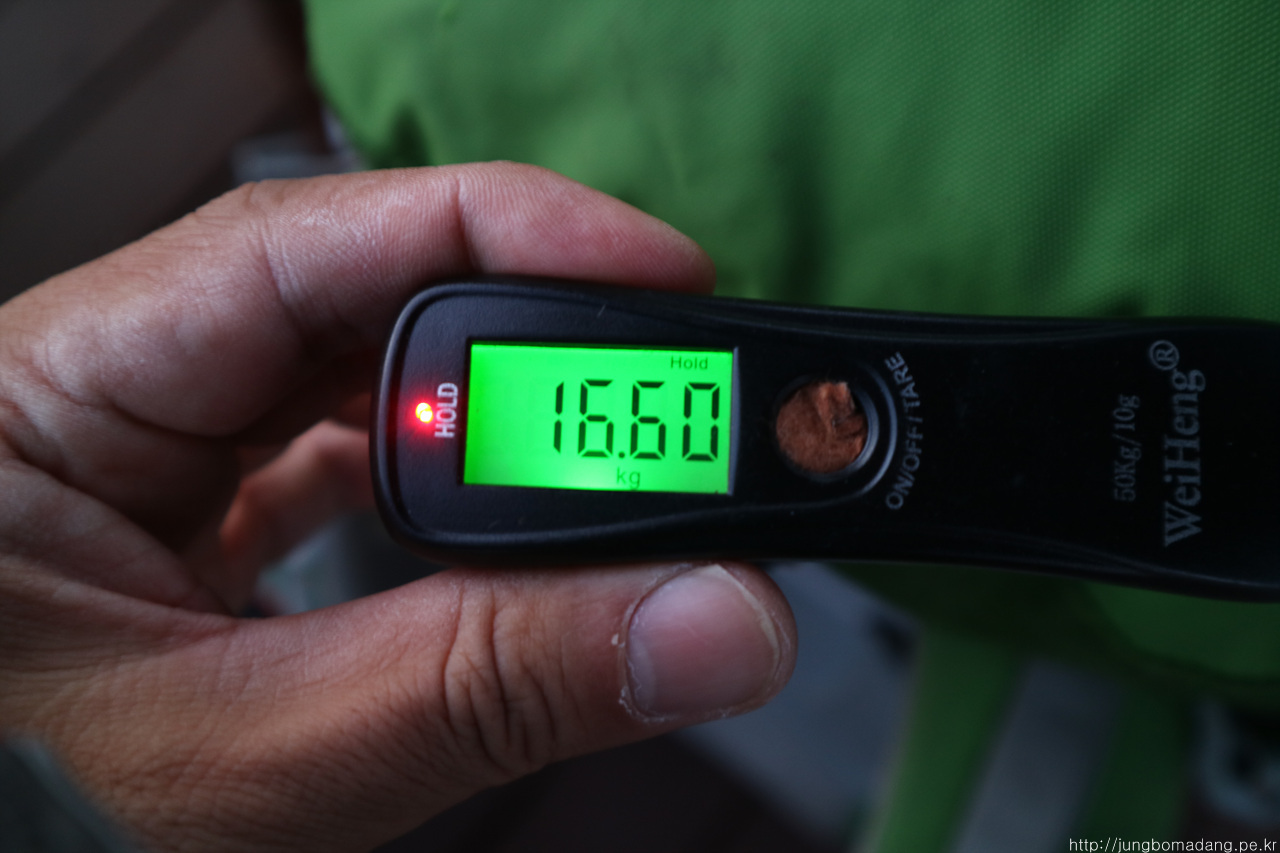 현재 배낭 무게는 16.6Kg니까 하나로마트에서 산 먹거리가 4.6Kg군요?