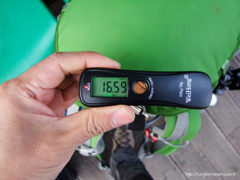 메인 배낭 무게는 16.6kg 합쳐서 21.6kg네요.