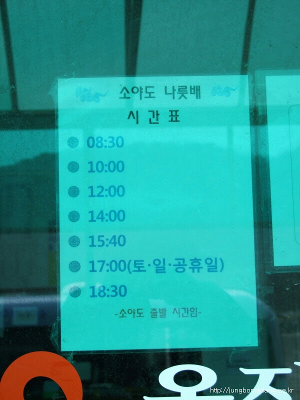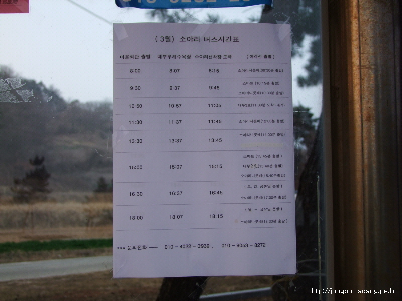 마을버스 시간표 입니다. 마을회관에서 버스가 대기 했다가 여기 떼부루해변을 거쳐 선착장(소야리)으로 갑니다. 들어올때는 배시간 맞춰 버스가 대기하므로 크게 신경 안쓰셔도 되구요.