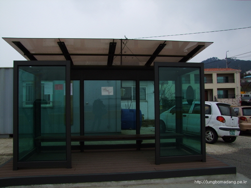 버스 정류장도 보이죠? 거기 버스 시간표도 붙어 있어요.