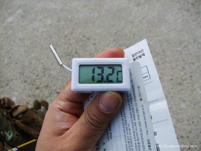 07:58 현재 영상 7.3도. 기상시에는 영상 6도였습니다. 간밤에 여름침낭에 핫팩 하나 터트리고 잘 잤네요. 물론 상체는 하글롭스 바이저 후드 자켓을 입고, 아래는 쫄쫄이 2겹을 입은 상태였구요.