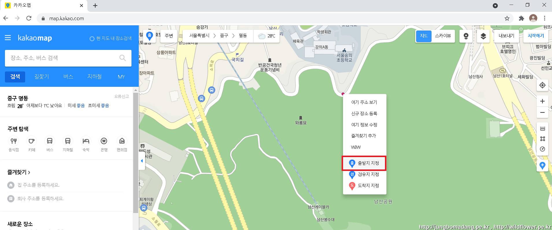 크롬에서 map.kakao.com 카카오맵을 접속 후 출발지 지정하시고,