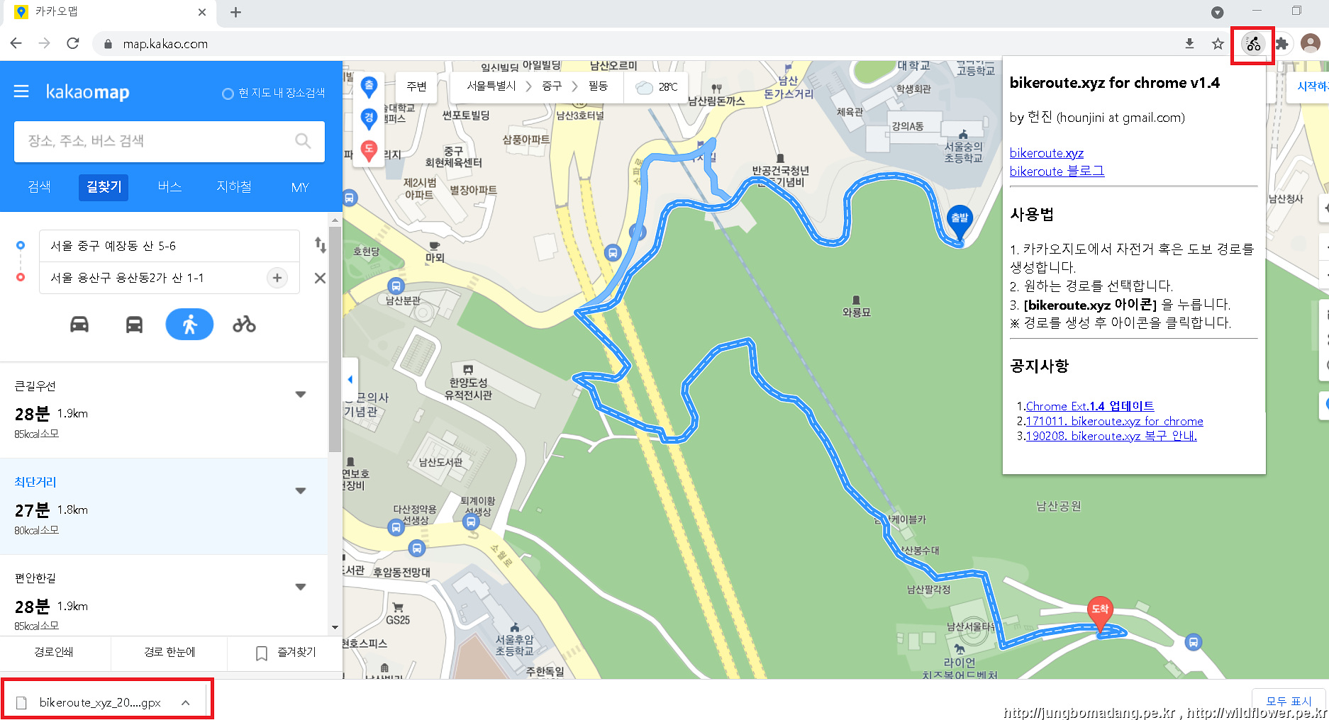 이와같이 좌측 아래 해당 경로가 gpx로 다운로드가 됩니다.
