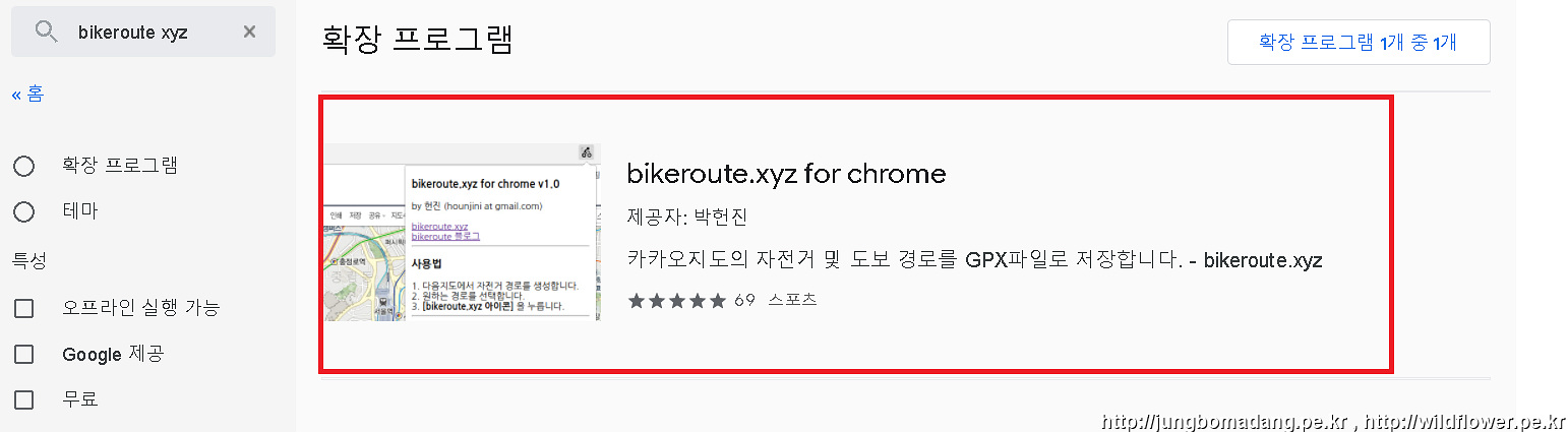 1-3. 확장 프로그램 등록 : 크롬 웹 스토어 좌측 산단 [스토어 검색]에서 [bikeroute xyz] 입력 후 검색합니다.
