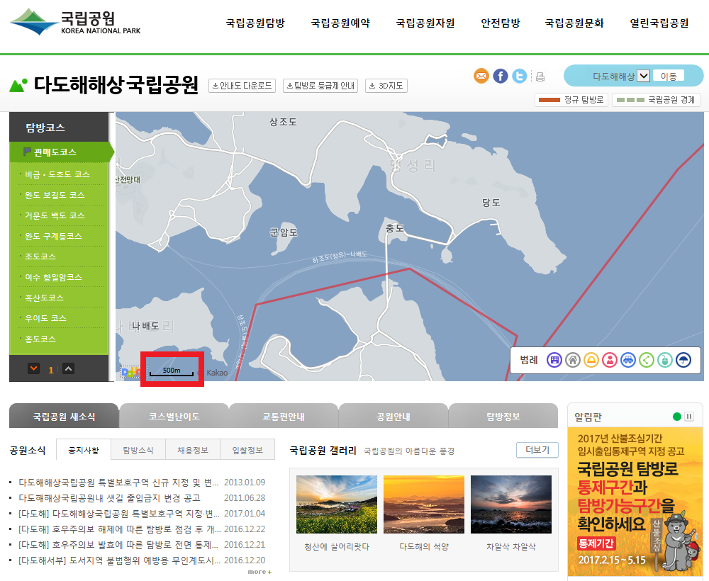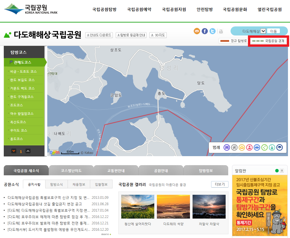 아래 빨간 네모박스처럼 지도 우측 위에 [국립공원 경계]라고 표시가 되어 있습니다. 바다(섬)일 경우 파란색 점선(-----)입니다.