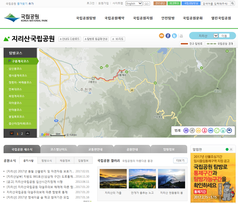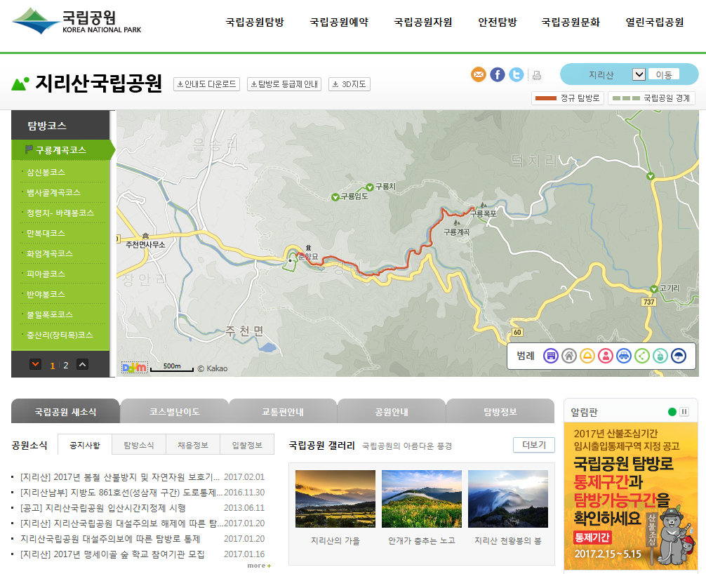 1. http://jiri.knps.or.kr/front/portal/visit/visitCourseMain.do?parkId=120100&vcursId=&vnewsId= 지리산 국립공원 홈페이지를 접속합니다. 아래 접속화면 보이시죠? 지도 보시면 국립공원 경계 표시인 초록색 점선이 보일겁니다(구룡폭포와 구룡계곡을 지나가는 점선). 아래 지도 가운데에서 마우스를 아래 방향으로 굴려서 지도 좌측 아래 500m 를 1Km로 변경해 봅니다.
