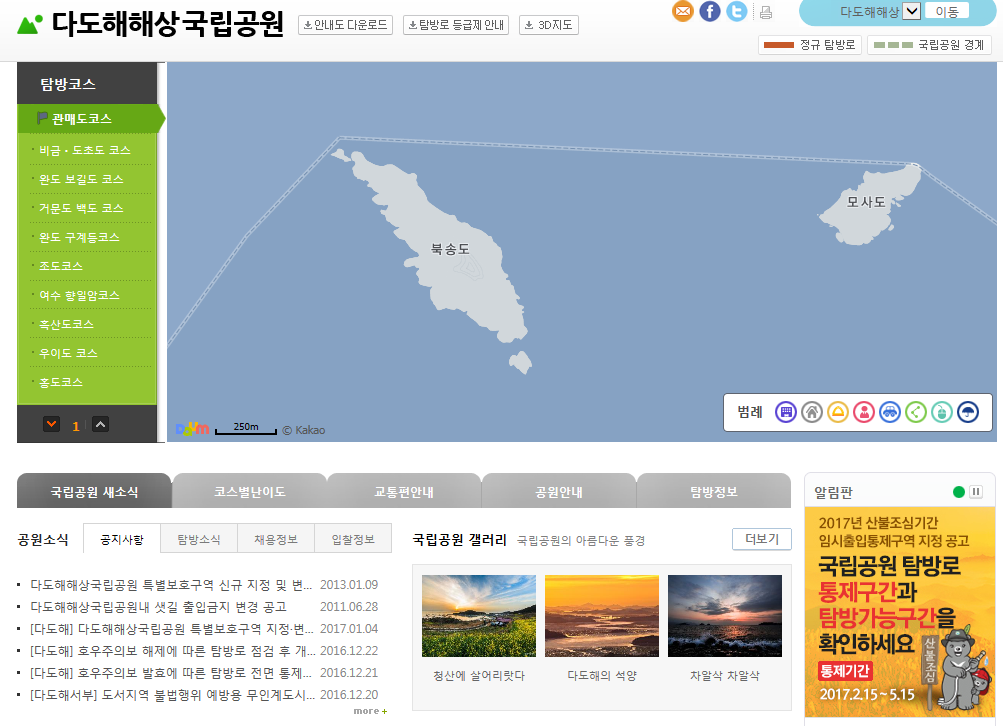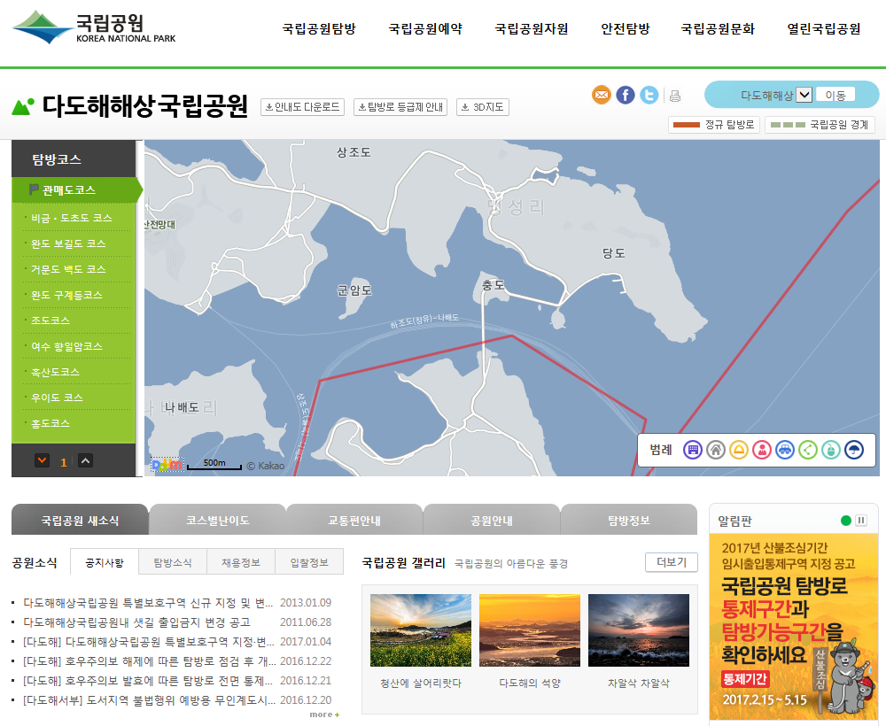 1. http://dadohae.knps.or.kr/front/portal/visit/visitCourseMain.do?parkId=121200&vcursId=&vnewsId= 다도해해상 국립공원 홈페이지 접속 합니다.