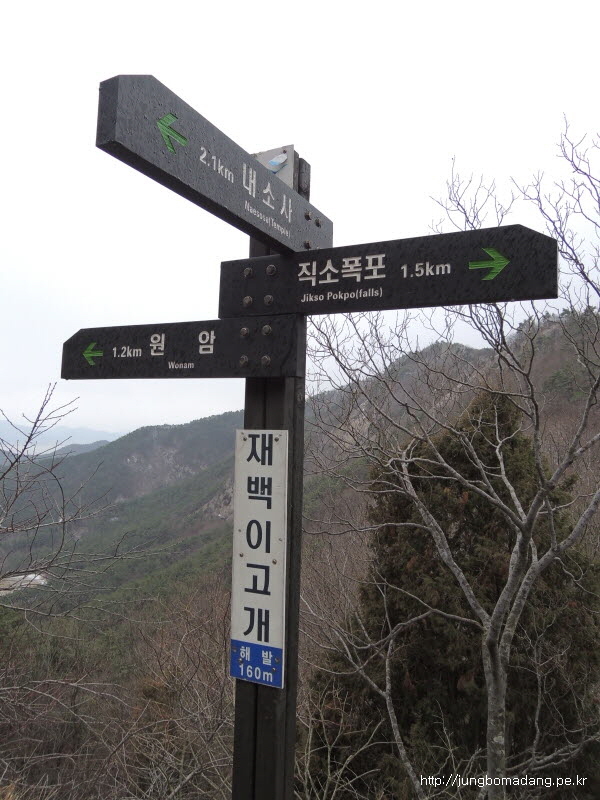 09:19 재백이고개. 내소사까지 2.1km 남았습니다. 여기서 중대한 결정을 합니다. 내일 수덕사,개심사 일정을 미루고, 오늘 하산후 바로 서울로 올라가기로 한거죠. 어차피 꼭 가보고 싶은 곳은 다 들렸으니 미련은 없네요. 오늘밤은 따뜻한 집에서 잘 수 있겠네요. 갑자기 힘이 납니다. ^^
