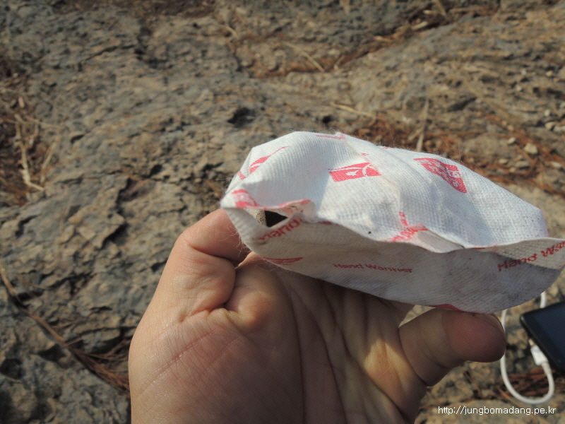 아! 여기서 충격적인건 어제 다이소에서 샀던 핫팩 2개중에 한개가 이렇게 터져버린 겁니다. 그덕에 내 자켓 주머니 안은 삐자져나온 내용물로 난장판... 다이소 화롯불 핫팩 절대! 사지 마세요. 데워지는 것도 늦고, 갑자기 뜨거워지고 이렇게 터지기까지.... 가격도 1000원이면 싸지도 않고!