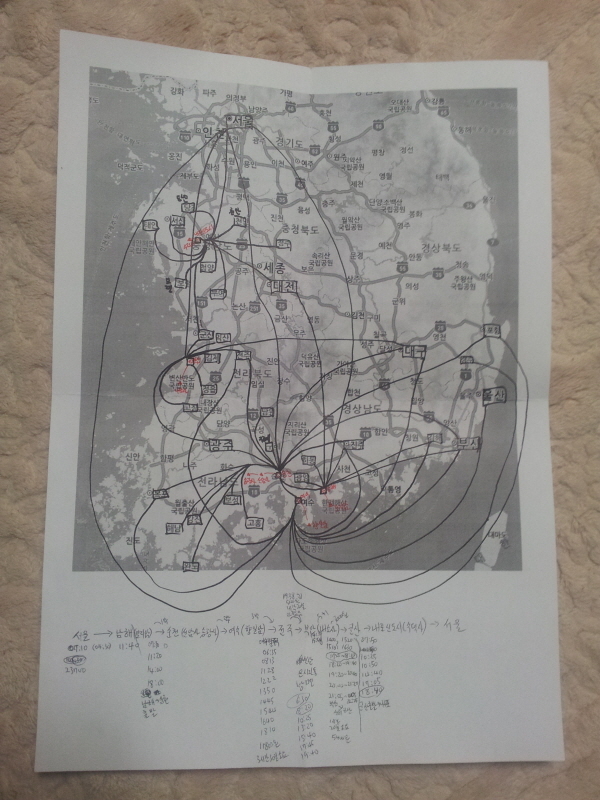 계획을 짜다보니 부안 내소사 경유하는 것이 마땅치 않아 머리를 짜보니 아래와 같이 지도에 동선을 그리게 되었습니다. 터미널(남해,순천,여수,부안,내포신도시(중간에 홍성으로 변경)~서울)에서 연결되는 각각의 터미널을 그려보니 결국 서울(남부터미널)~남해~순천~여수~(전주 열차 경유)~부안~(군산 열차 경우)~홍성~서울(남부터미널) 이런식으로 대중교통으로 연결이 되게 됩니다.