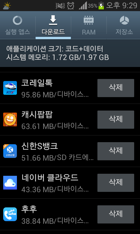 총 1.97GB중에 1.72GB 사용중으로 약 250MB 정도 남았는 데도 문제가 있네요.