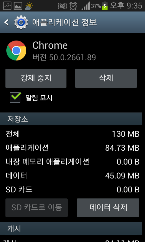 그래서 용량이 큰 어플부터 삭제를 합니다. 특히 별도로 설치한 크롬을 일순위로 지웁니다.