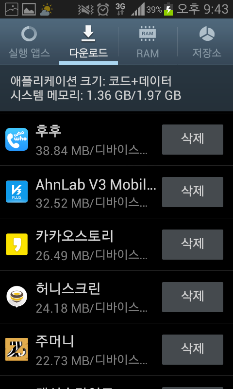 그 외에 어플 몇개 더 정리하니 1.36GB로 사용량이 줄었네요. 610MB 여유 용량이 남은 셈이죠.