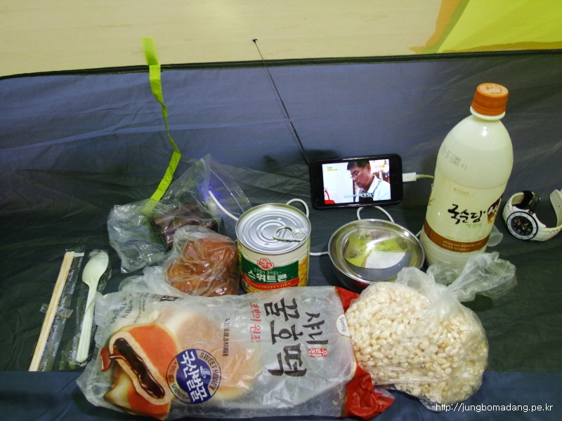 텐트 안에 입성! 헐~ 대박! DMB가 잡히네요... 그것도 전 채널이... 일단 가장 시원한 유통기한 1년짜리라는 국순당쌀막걸리부터 오픈합니다. 안주는 일단 스위트콘 먼저!