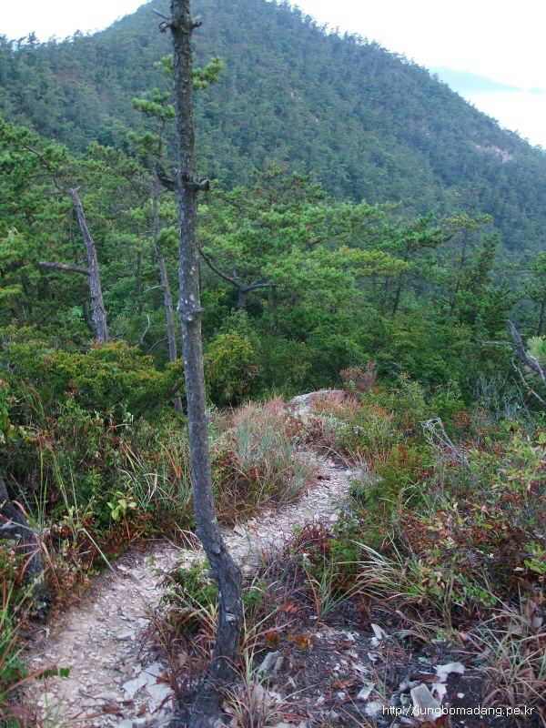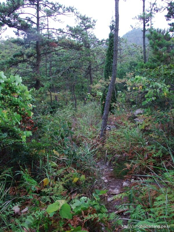 그러거나 말거나 전 하산을 시작합니다. 사실 5개의 섬을 이잡듯이 자세히 스캔하려고 했는 데, 섬 전체가 공사판이고, 길도 별로고, 날도 폭염이고, 그냥 바로 자장구 있는 데 가서 군산으로 가서 밥이나 때리고 집에 가기로 합니다. 대봉전망대 오름길도 약간 밀림이었는 데, 내려오는 길도 밀림이라 고생이 많네요... 젤 싫은 건 거미줄~~ 읔~~ 이런길은 차라리 양반입니다.