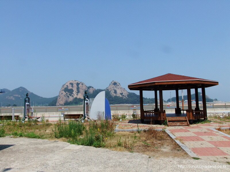 장자대교와 우측편으로 대장도(대장봉)가 보이구요. 흰색 장자대교는 공사중으로 통행 안되고 자전거나 도보로 우측 철교같은 임시교로 넘어갈 수 있답니다.