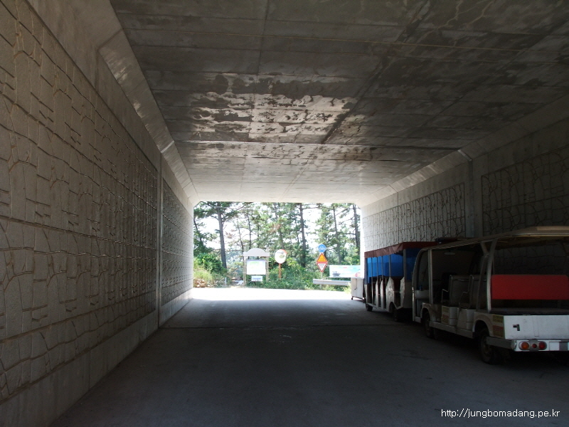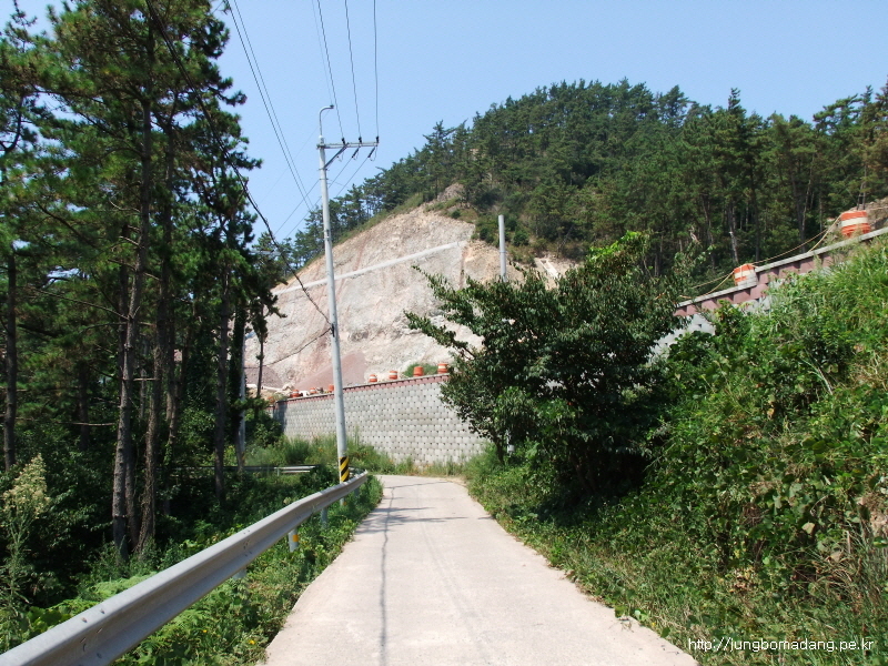내리막 우측편으로 요해 통행금지 체인을 걸어 두었는 데, 그 우측 빈틈으로 지나가서 입성하면 됩니다.