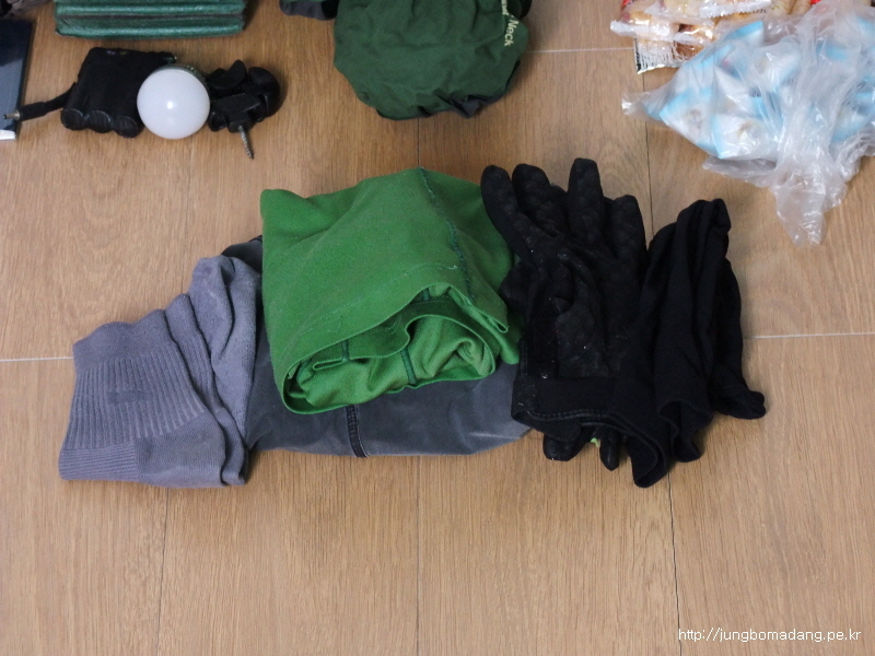 의 : 반팔티 여분 1개 125g, 바람막이 자켓, 양말 1개(여분) 50g, 반바지겸용바지 1 개 350g, 팬티 1개(여분) 20g, 손수건 1개 36g, 버프 1개 29g, 노스페이스 고어텍스 모자, 선글라스 22g, 차코샌들.