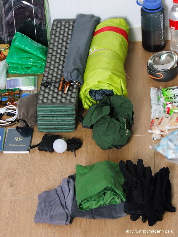 주 : 농협 텐트(후라이,폴대,T팩3개), 침낭라이너 500g, 비상보온포 1개 50g, 코베아 에어목배게 , 접이식 1인용 발포매트, 자작 랜턴(충전기 포함-블박 겸용).