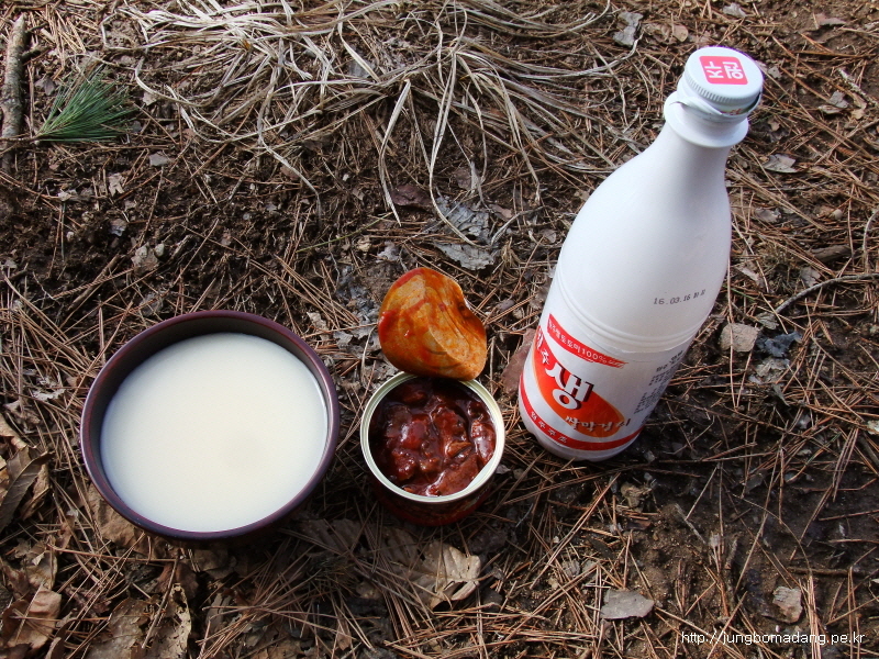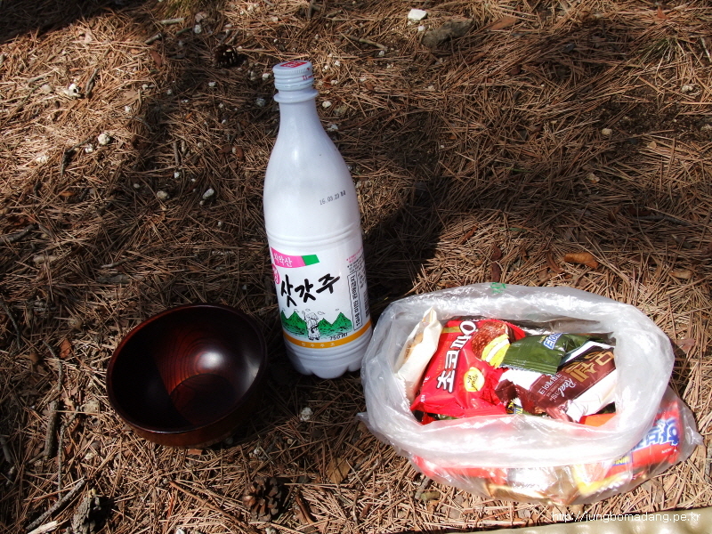 10:59 잠시 쉬면서 막걸리를 마십니다. 안주는 매콤?골뱅이캔 별미네요~ 여기까지 올라오는 등산로도 꽤 가파르네요.