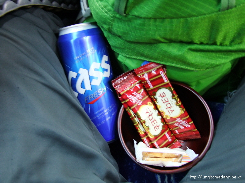 07:05 출발~. 스토리웨이에서 습득한 맥주와 집에서 챙겨온 과자 쪼가리에 한잔 걸칩니다!
