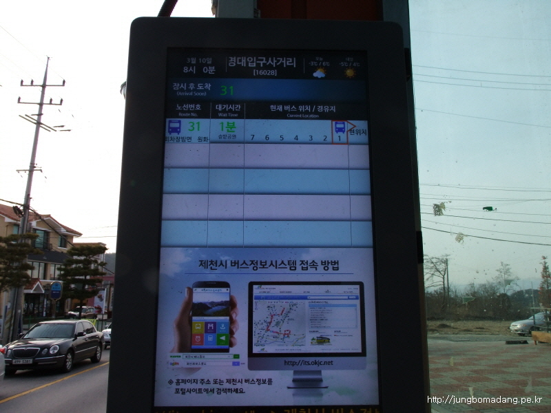 07:54 세명대사거리(세명대는 학생수가 세명밖에 안된다는 개그 칠라다 안할 랍니다 - 이미 했자나!!!)에 있는 안모산 정류장입니다. ^^ 여기서 08:00 31번 버스를 타고(15분간격으로 운행)