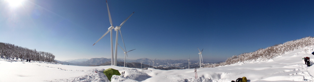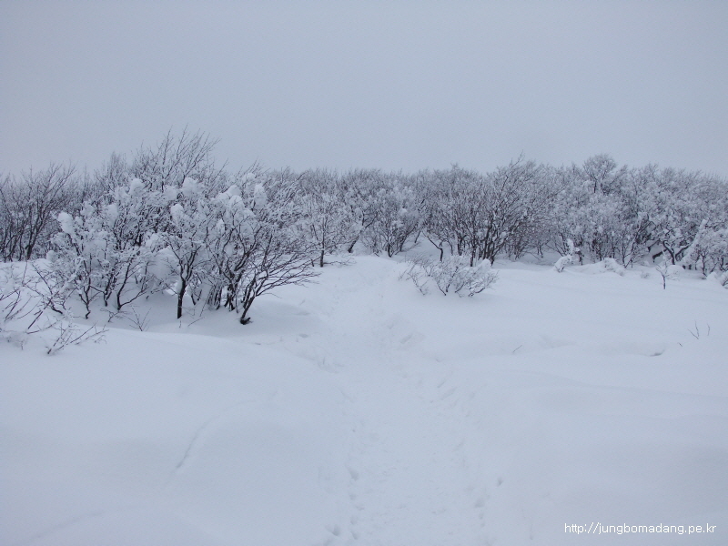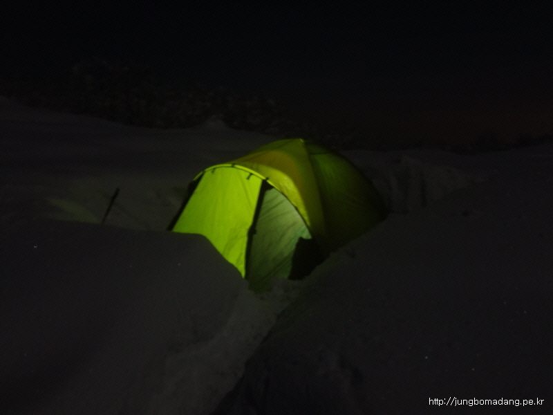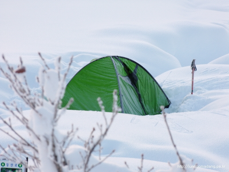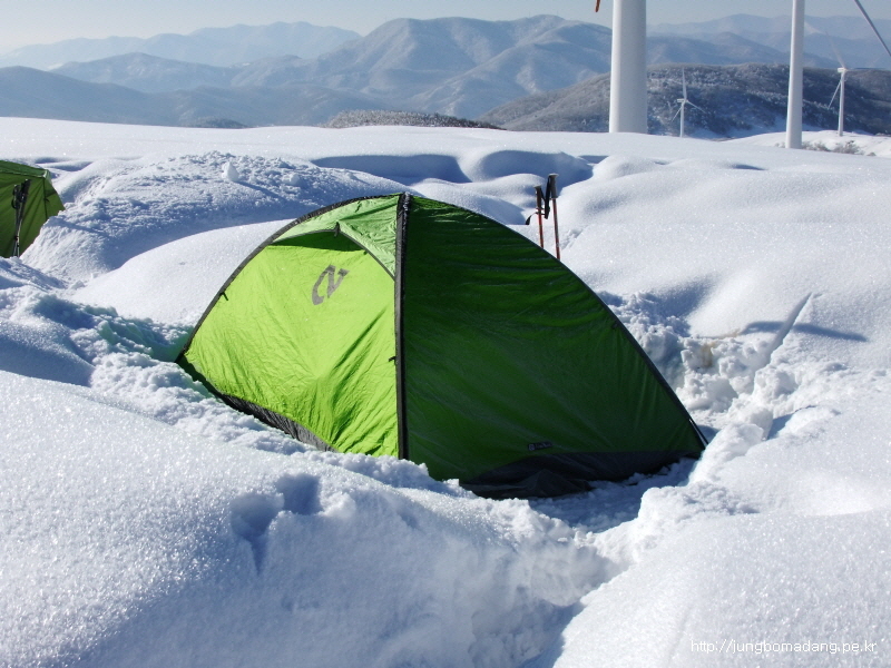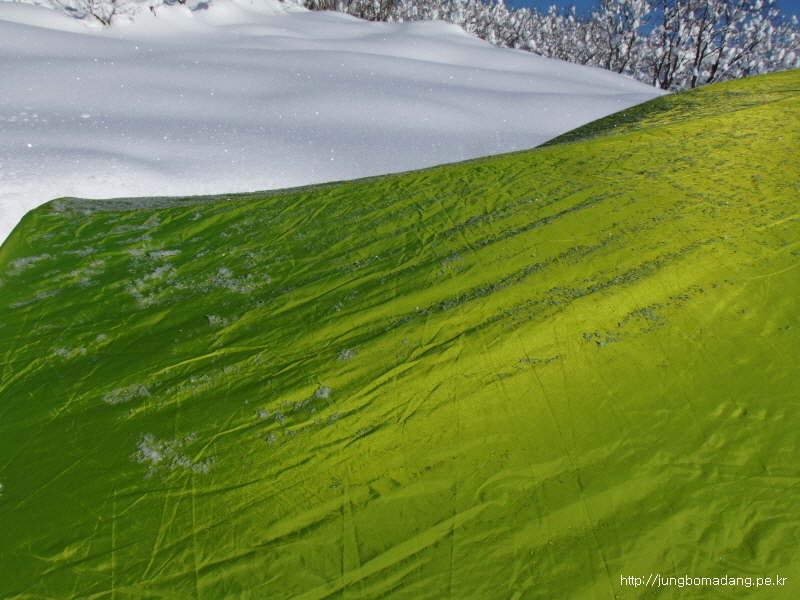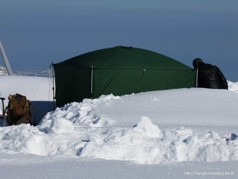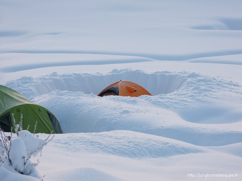 선자령 도착 100미터전에 다행히 박지가 있어, 온 몸으로 다지고, 베이스캠프 자리와, 텐트 3개 자리를 더 확보합니다.